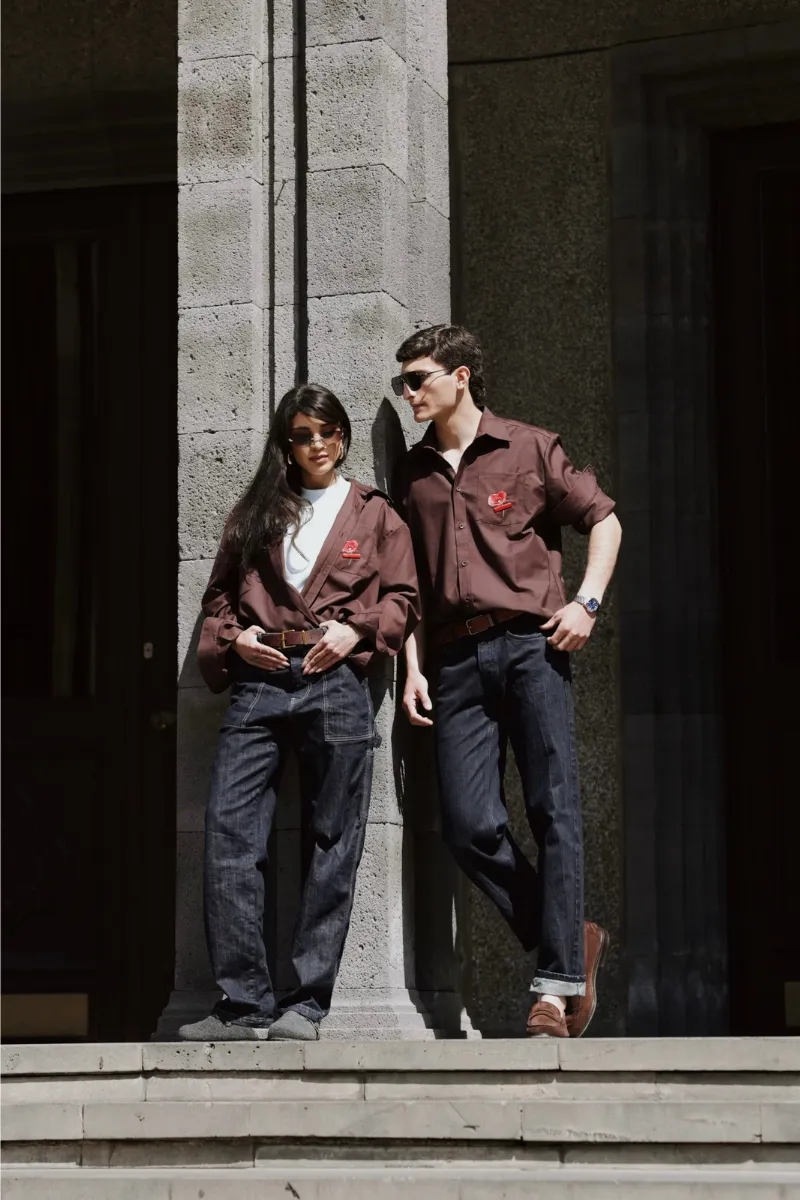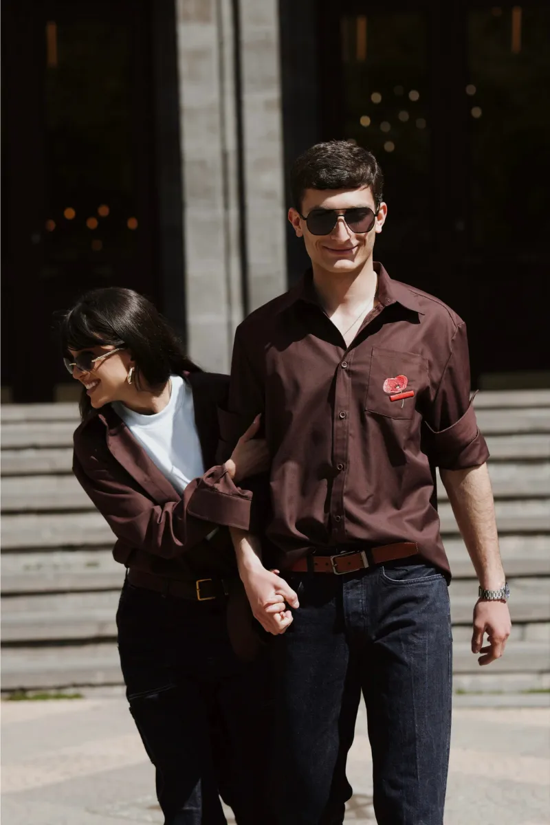 Oversize շապիկ՝ CLÉ-ի ֆիրմային ասեղնագործությամբ խակի և մուգ շագանակագույն գույներով։