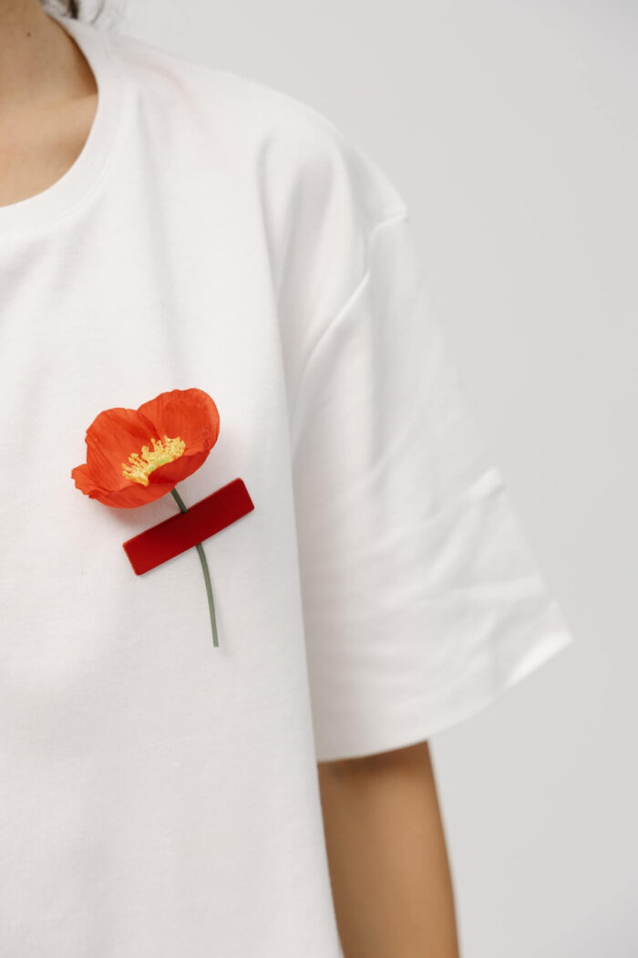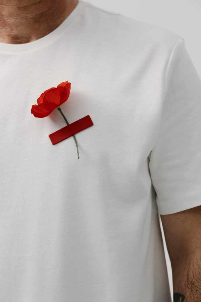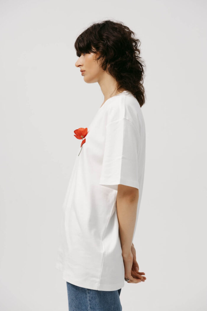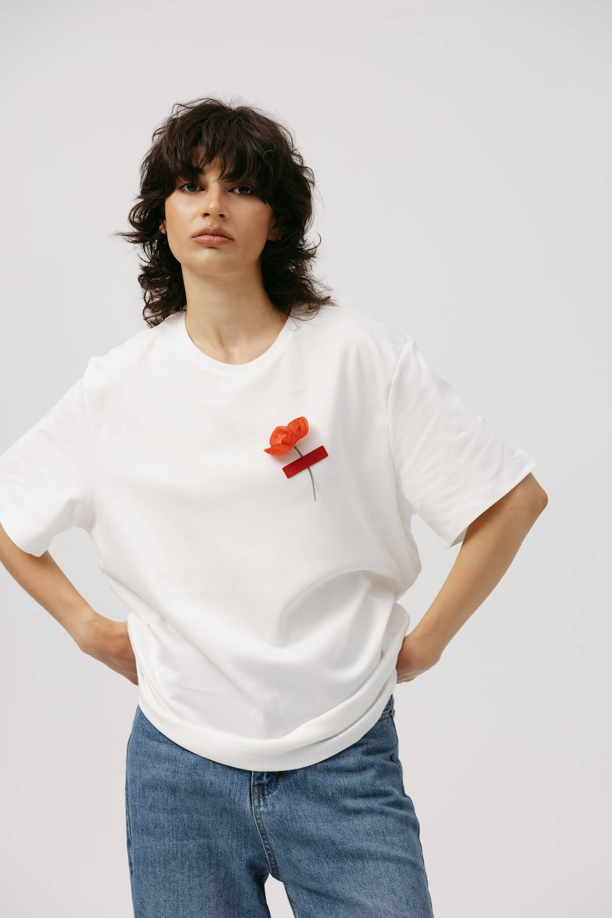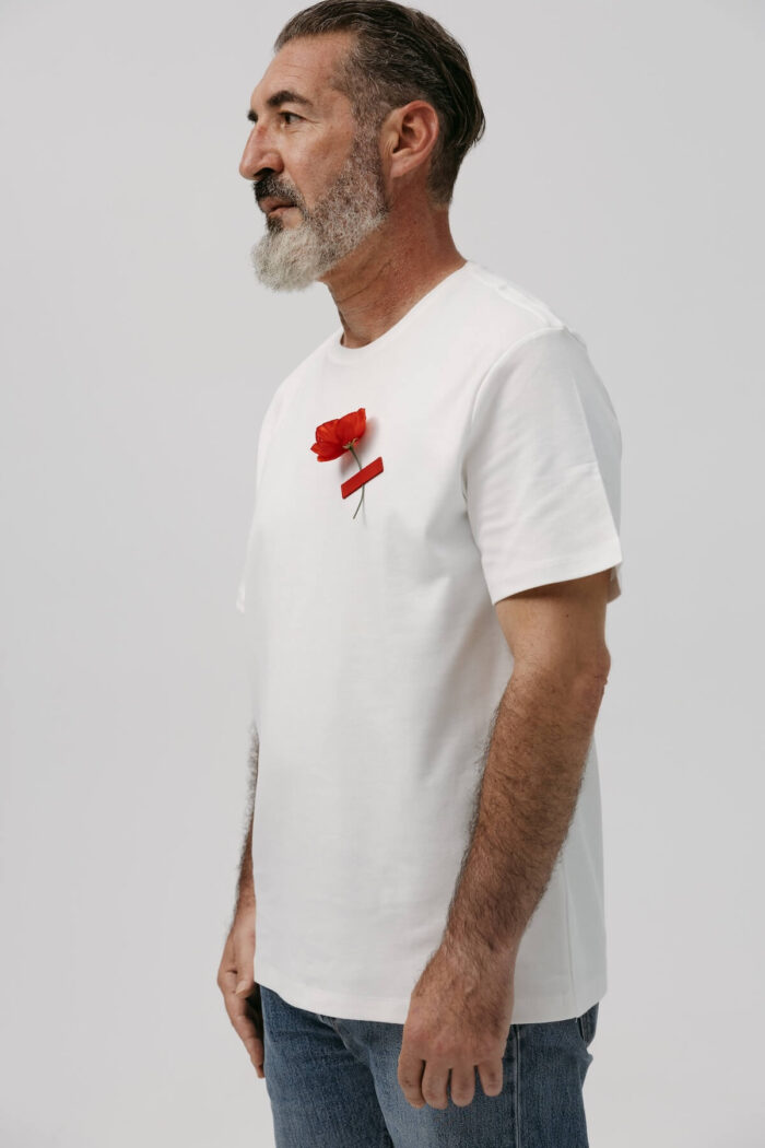 Classic white tee with iconic red poppy detail. Soft 100% cotton. Unisex style for versatile, elegant looks.